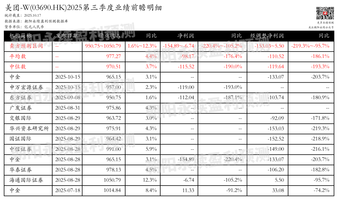 预测公司Q3营业收入950.75~1050.79亿元,同比增长1.6%~12.3%;预测Q3净利润-154.89~-6.74亿元,同比变动-220.4%~-105.2%;预测Q3经调整净利润-153.03~5.50亿元,同比变动-219.3%~-95.7%。